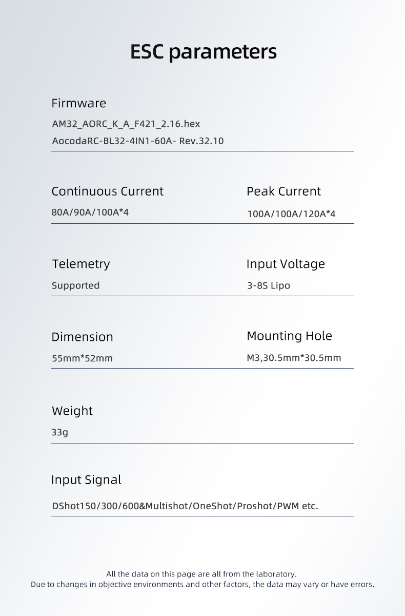 - Input Signal: DShot150-600/Multishot/Oneshot/Proshot/PWM