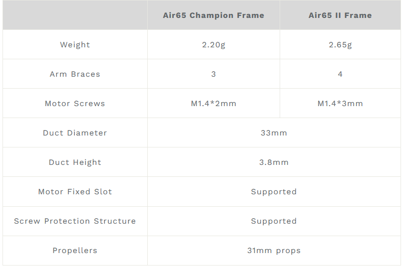 Engineered with one goal—to be the lightest 65mm frame without compromise—the Air65 Champion takes the proven geometry and duct design of Air65 II and pushes it further. By reducing the arm braces and more, it achieves an ultra-light weight of just 2.20g—17% lighter than the Air65 II—a perfect balance between resilience and weight savings.