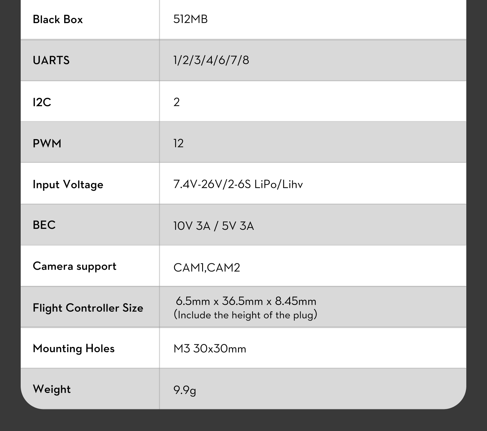 - Flight Controller Size: 36.5mm x 36.5mm x 8.45mm(Height including plug)