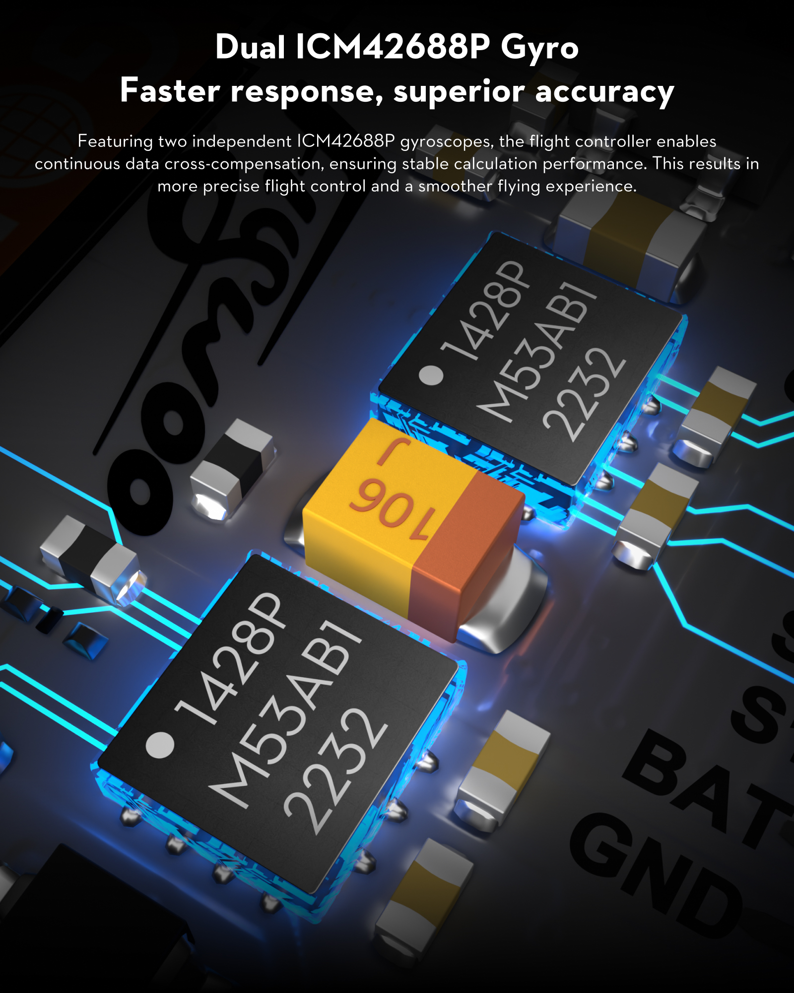 2. Dual Gyro Stability: ICM42688P dual gyroscopes reduce noise/latency for smoother flight.