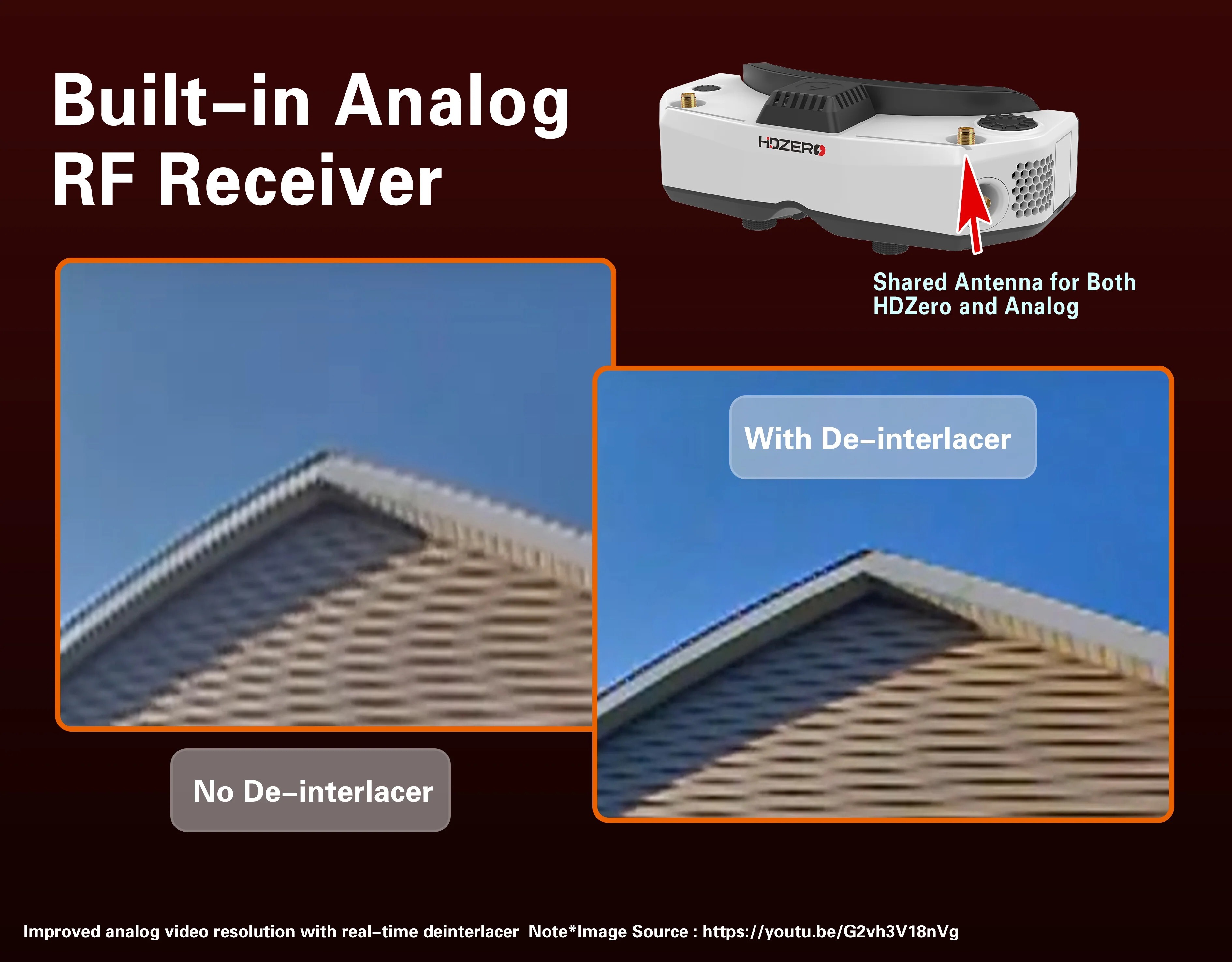- Built-in analog receiver sharing antenna with HDZero receiver