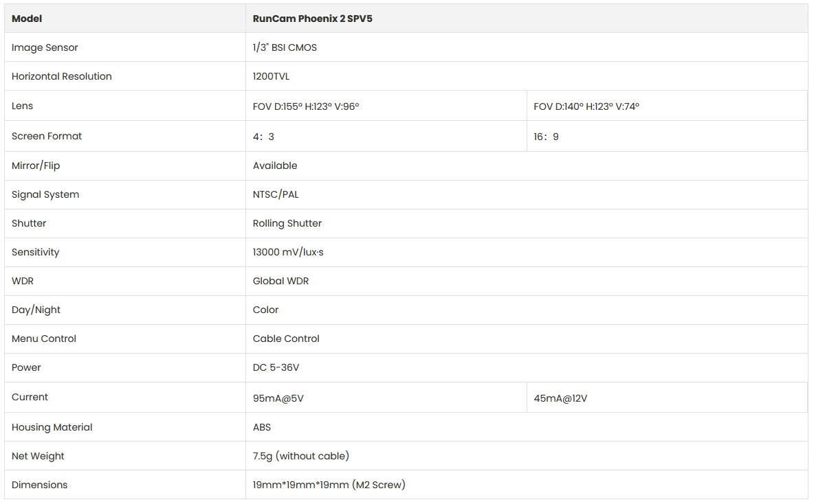• 1x Runcam Phoenix 2 SPV5 Camera
