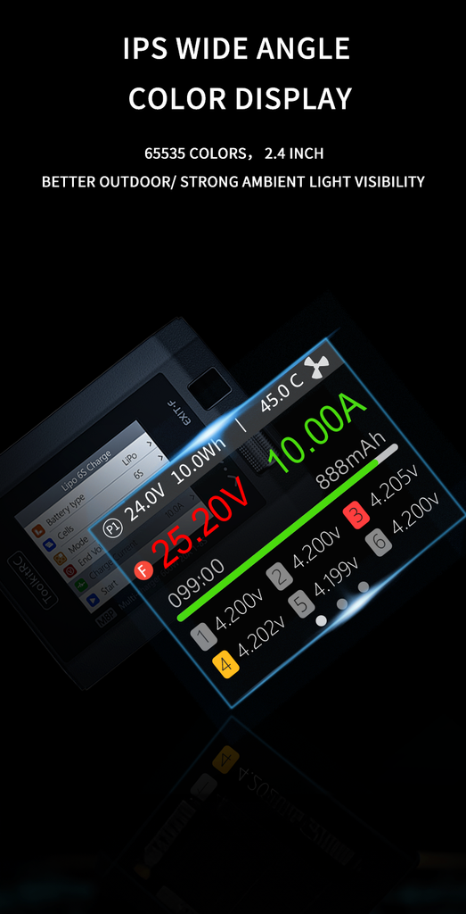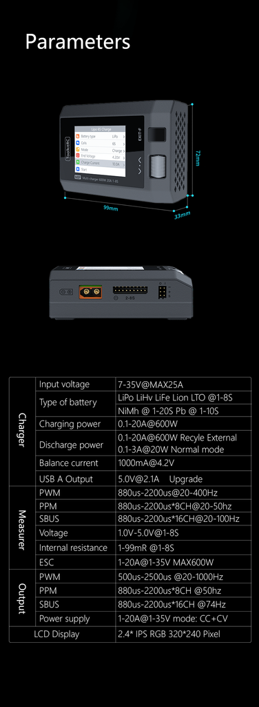 - Battery Type: LiPo LiHV LiFe Lion LTO @ 1-8S NiMh @1-20S Pb @1-10S